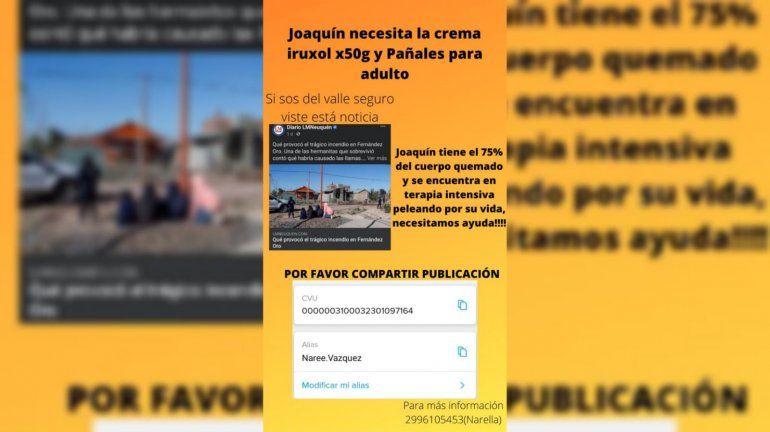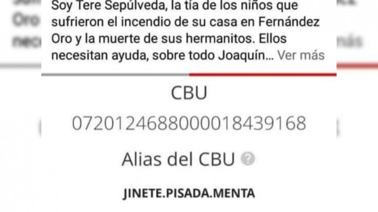 Su tía Tere Sepúlveda también proporcionó dos CBU para girar dinero, en caso de que la gente no se pueda acercar hasta Fernández Oro.