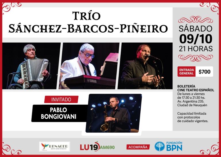Tío Sánchez-Barso-Piñeiro en el Español. Daniel Sánchez, Miguel Ángel Barcos y Marcelo Piñeiro llega a Cine Teatro Español para presentar un espectáculo de música argentina con historias, relatos y anécdotas con Pablo Bongiovani (saxo) como músico invitado. Venta de entradas en Av. Argentina 235. General: $700.