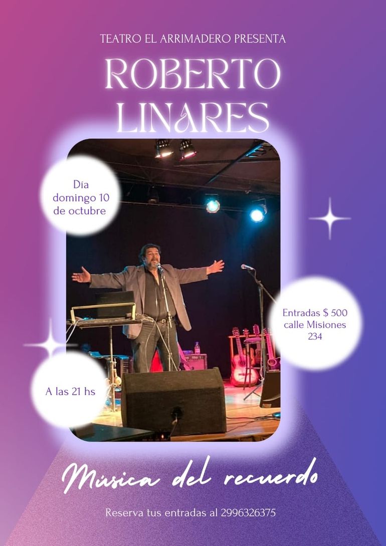 Además, la música continúan en el Teatro Arrimadero con "Música del recuerdo" con Roberto Linare. Este evento será el domingo 10 de octubre, desde las 21:00, en el que se interpretará clásicos de todos los tiempos, homenajeando a todas las madres. Con más de 20 años de trayectoria musical, Linares brindará un show único con artistas invitados. Valor de entradas: $500. Reservas y consultas al 2995 34-7678.