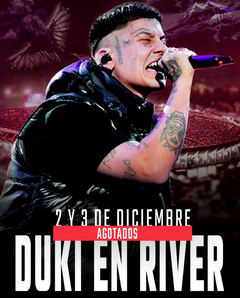 Duki, el cantante más convocante de la escena urbana argentina, agotó este viernes en pocas horas todas las entradas para dos conciertos que serán en el mes de diciembre en el estadio Monumental de River Plate. Al vender los 85 mil boletos de la primera función en cuestión de minutos, se habilitó una segunda que también fue arrasada por los fanáticos.