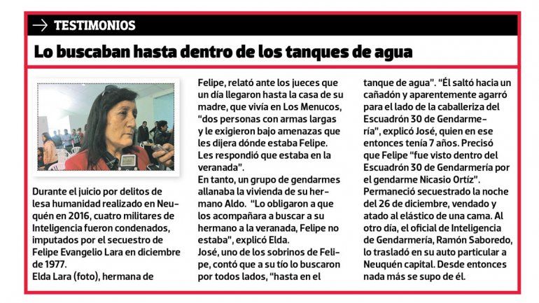En esos años, Fito acompañó varias veces a su abuela a la guardia de Gendarmería de Chos Malal para saber qué había pasado y dónde estaba Felipe. “Fue doloroso haber acompañado a mi abuela, verla llorar y sufrir por su hijo. Era muy fuerte el dolor que tenía”, dijo en una entrevista con este diario cuando se desarrollaron las audiencias del juicio donde se ventiló el caso de Felipe Lara.