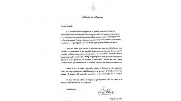 "Querido Mauricio. En el día de hoy he decidido presentar mi renuncia al cargo de ministro de Hacienda de la Nación, que he ejercido desde enero de 2017. Lo hago convencido de que, en virtud de las circunstancias, la gestión que liderás necesita una renovación significativa en el área económica. Considero que mi renuncia es coherente con la pertenencia a un gobierno y espacio político que escucha a la gente, y que actúa en consecuencia.