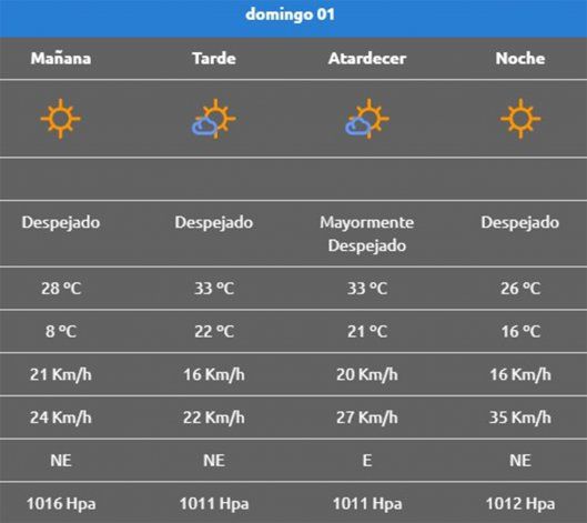 En horas de la tarde de este domingo, los cielos neuquinos continuarán despejados a lo largo de todo el día, sin probabilidad de que llueva. La temperatura aumentará levemente y alcanzará su máxima con 33 grados Celsius. De igual forma, Neuquén espera los vientos del sector noroeste que alcanzarán una velocidad máxima de hasta 20 kilómetros por hora.