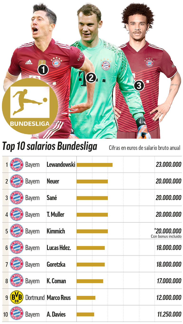 En Alemania, la estrella con el mejor contrato es el polaco Robert Lewandowski, con 23 millones de euros. En el Top 10 de la Bundesliga, nueve son jugadores del Bayern Múnich, a excepción de Marco Reus, del Borussia Dortmund, quien figura noveno en la tabla con 12 millones de euros.