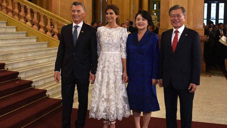 Tras la llegada de Macri y Awada, ellos tomaron el relevo para la recepción de los mandatarios dentro del teatro, al pie de las escaleras de mármol de Carrara, donde fueron saludando a jefes de Estado y líderes como Donald Trump, la recién llegada Angela Merkel, Emmanuel Macron, Xi Jinping, Christine Lagarde y Vladimir Putin, uno de los últimos.