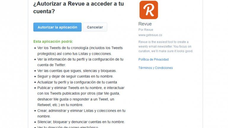 La app pedirá a los usuarios los permisos que solicita Revue a quienes quieran integrar la nueva herramienta. Entre otros asuntos, hay que dar permiso para publicar y eliminar Tweets en tu nombre, e interactuar con los Tweets publicados por otros (dar Me gusta, deshacer Me gusta o responder a un Tweet, un Retweet, etc.) en tu nombre".