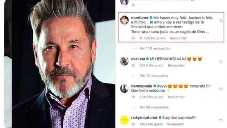 "Me haces muy feliz haciendo feliz a mi hijo... te amo y voy a ser testigo de la felicidad que ambos merecen", comenzó diciendo el intérprete de "Cachita" para celebrar la noticia. "Tener una nuera judía es un regalo de Dios...", remató.