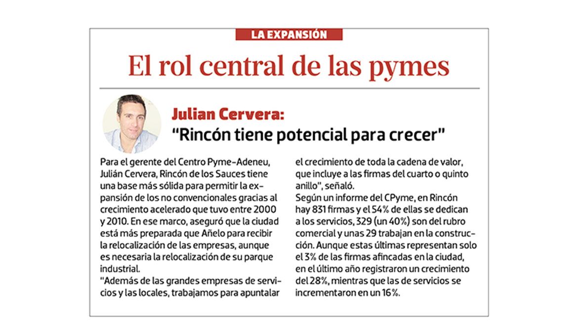 Julián Cervera, gerente del Centro PyMe-Adeneu, aseguró que los proyectos abren las puertas a la relocalización de empresas neuquinas que ya proveen servicios petroleros pero que podrían pensar en mudarse porque la distancia de 230 kilómetros entre esta ciudad y la capital no permitiría los traslados diarios. En ese marco, mencionó la importancia de la relocalización del parque industrial para que se emplacen las compañías y que acompañen a las más de 800 firmas ya presentes en la ciudad, que nacieron al calor de la explotación convencional de El Trapial y hoy podrían expandirse o sumar nuevas ramas de negocios gracias al empuje del shale.
