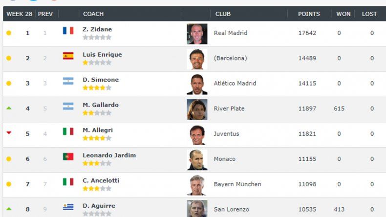 El director técnico de River, Marcelo Gallardo, también quedó entre los cuatro mejores entrenadores del planeta, según este ranking. Es el mejor argentino, por delante del DT de la Selección, Jorge Sampaoli (12º); y de Guillermo Barros Schelotto, DT de Boca (24º).