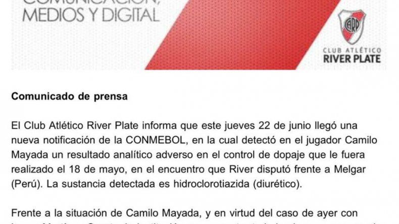 "Llegó una nueva notificación de la CONMEBOL, en la cual detectó en el jugador Camilo Mayada un resultado analítico adverso en el control de dopaje que le fuera realizado el 18 de mayo, en el encuentro que River disputó frente a Melgar (Perú)".