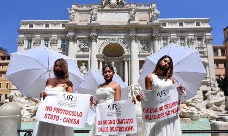 Un grupo de novias alzó la voz en la ciudad de Roma para protestar por el aplazamiento de los casamientos que debieron celebrarse desde el pasado otoño. Las bodas forman parte de una de las tantas actividades sociales que se vieron afectadas por en coronavirus, el cual, mantuvo a Italia al menos tres meses bajo confinamiento social.