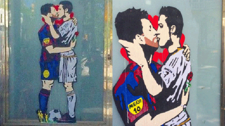 Tvboy graficó a Lionel Mess y Cristiano Ronaldo dándose un apasionado beso. La imgane apareció en el Paseo de Gracia de Barcelona y se titula “El amor es ciego”.