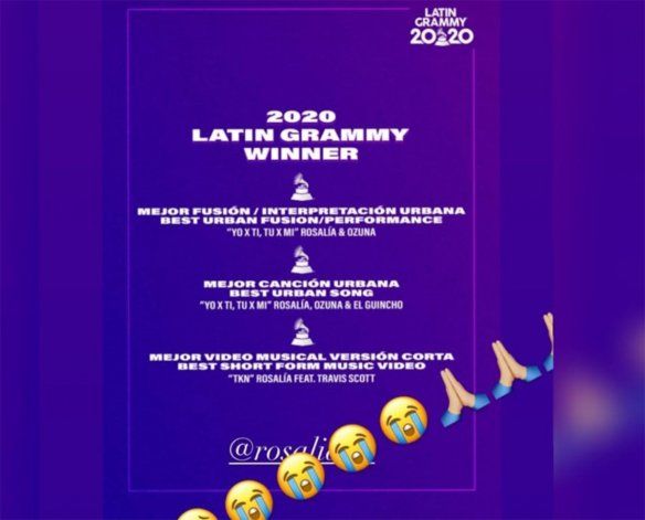 A través de los Stories de su cuenta de Instagram, plataforma donde acumula casi 14 millones de seguidores, replicó una publicación de un usuario llamado Alberto Cusell. Se trata de una foto que resume los galardones obtenidos por Rosalía en los Latin Grammy 2020.
