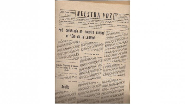 El periódico también narró, desafiante, las reuniones realizadas para recordar “El día de la Lealtad”. Sus páginas fueron portadoras de todos los pormenores de ese acto, donde se resaltó palabras y emociones vividas con motivo de conmemorar el 17 de octubre de 1945. Como vemos, Nuestra Voz era fiel vehículo de las convicciones de sus responsables.