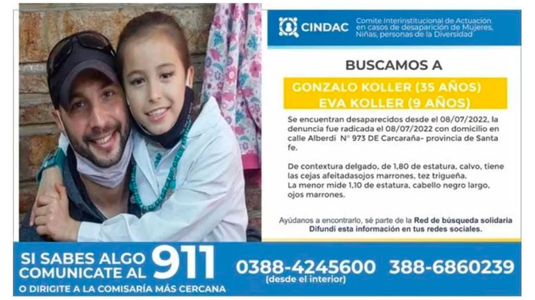 “Se solicita la colaboración de la población para dar con el paradero de Gonzalo Koller, de 35 años, 1.80 metros, contextura física delgada, tez trigueña, pelo corto calvo, ojos color marrón y tiene las cejas afeitadas; y de Eva Koller, de 9 años, 1.10 metros, contextura delgada, cabello largo color negro y ojos marrones. Ambos faltan de su domicilio en la ciudad de Carcañá desde el día 8 de julio de 2022, entre las 5.10 y 5.15 AM, cuando se retiraron de su domicilio a bordo de un automóvil Volkswagen Polo color blanco”, detalla el escrito que se difundió por redes sociales.