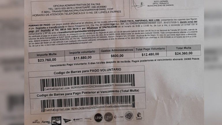 El Municipio también le hizo saber que si pagaba en el plazo de los cinco días hábiles posteriores a la notificación que no fue, porque la carta se la dejaron en la reja, tenía la posibilidad de pagar 12 mil pesos. Es decir, la mitad de la multa.