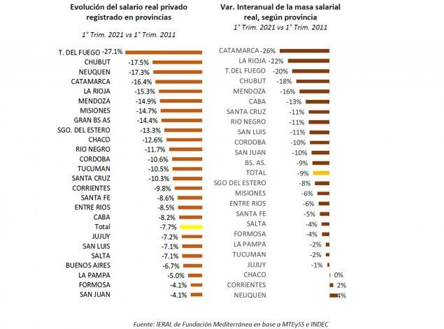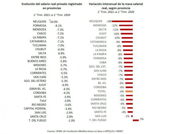 De todas las provincias argentinas, Tierra del Fuego fue la única que incrementó su masa salarial de un año a otro un 5 por ciento; las demás terminaron con un resultado negativo. En el informe de Ieral, los autores recalcan que, junto con Neuquén, “Mendoza, Salta y Jujuy fueron las provincias con mayor caída interanual”.