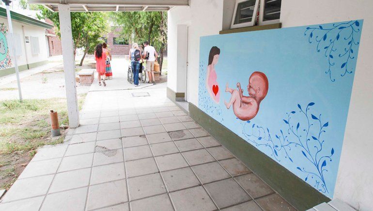 El mural se pintó a fin de año en una pared interna del hospital. Tiene un fondo celeste y las figuras de una embarazada y un feto. A un lado habían escrito "salvemos las 2 vidas" y "HBR provida", junto al símbolo de la campaña contra el aborto legal.