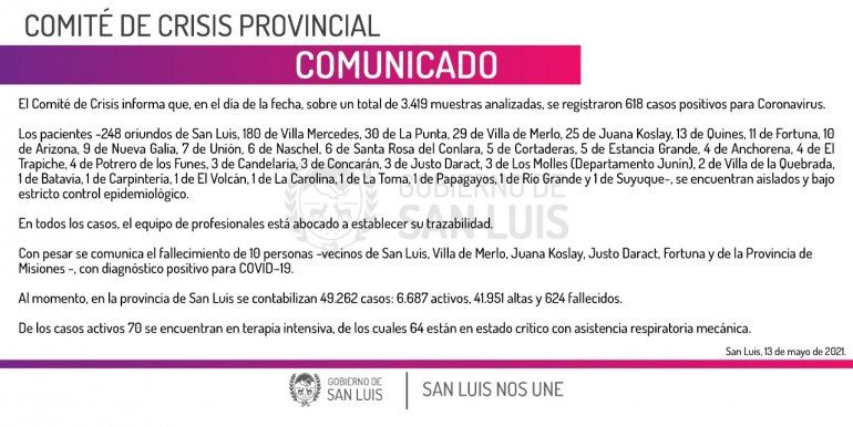 El reporte oficial fue emitido desde la Casa de Gobierno puntana y estuvo a cargo de la jefa de Gabinete, Natalia Zabala Chacur, quién enfatizó que "la sociedad puntana no se comportó como debía y por ese motivo siguen aumentando los índices de contagiados y de fallecidos, y el sistema de salud está tensionado".