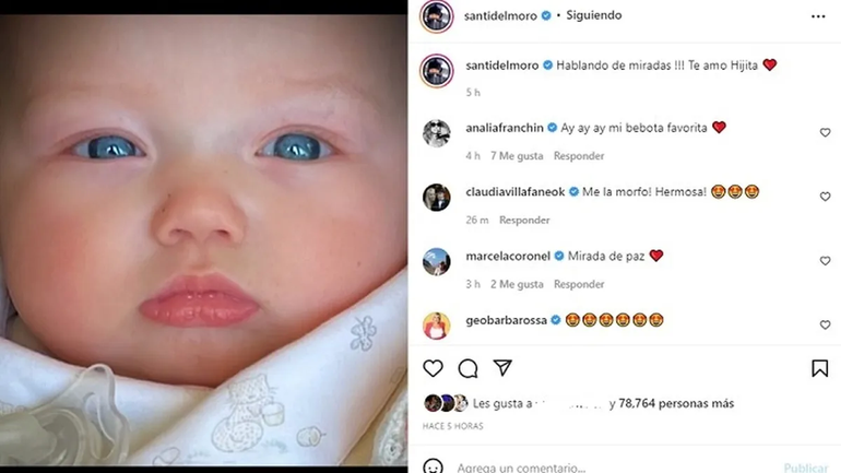 "¡Hablando de miradas! Te amo Hijita", escribió Santiago del Moro en su cuenta de Instagram junto a una foto de Santa, quien el próximo 25 de agosto cumplirá sus primeros 5 meses de vida.
