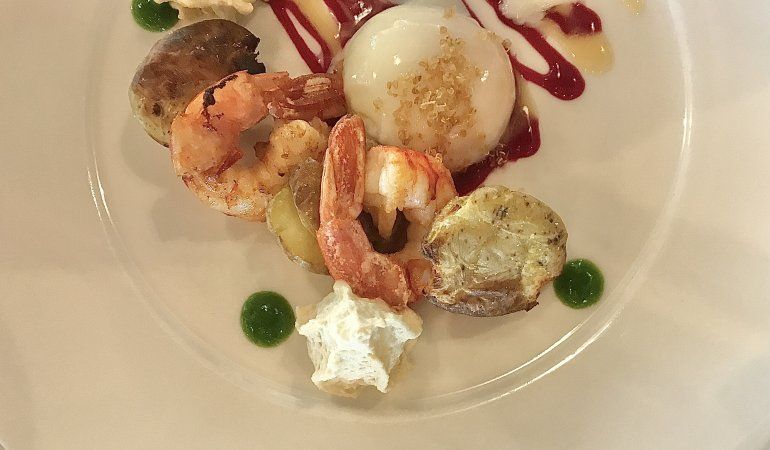 La opción 2 arranca con langostinos que explotan con un huevo a baja temperatura, un par de papines asados y una deliciosa espuma de cebolla confitada (cremosidad superior). Se le suma crispy de quinoa sobre el huevo. Letal. Sigue con Risotto de calabaza y provoleta, y unos bifecitos de cordero deliciosos, uvas y pan grattato.