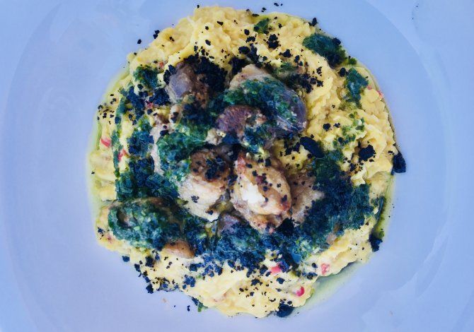 Criollo: molleja, humita y pesto de albahaca y perejil. Sándwich de bife de chorizo, provolone, salsa criolla con manzana, ensalada de coleslaw y papas rústicas. Postre a elección.