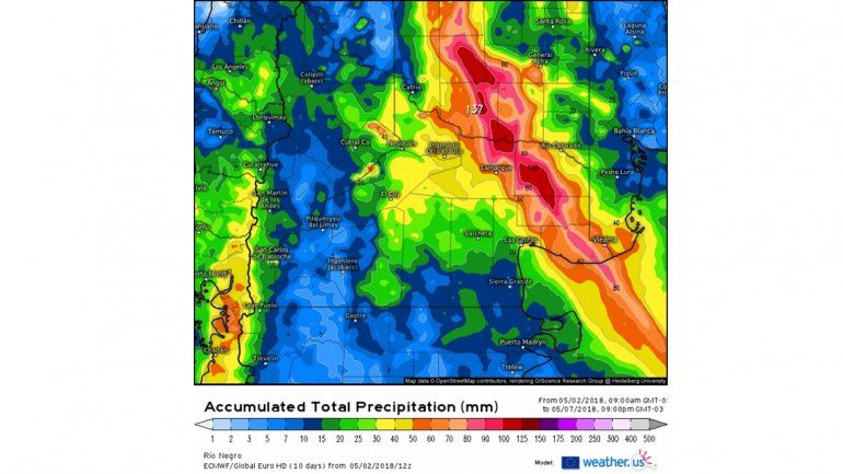 Según el modelo europeo de pronóstico (ECMWF), una buena parte de la zona podrá superar los 40 mm, pero hacia Valle Medio algunos sectores podrían sumar más de 100 mm según la estimación de este modelo.
