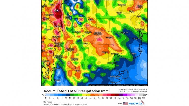 Para el modelo GFS (modelo americano), la zona de Alto Valle y Valle Medio tendrá acumulados más homogéneos por encima de los 60 mm.
