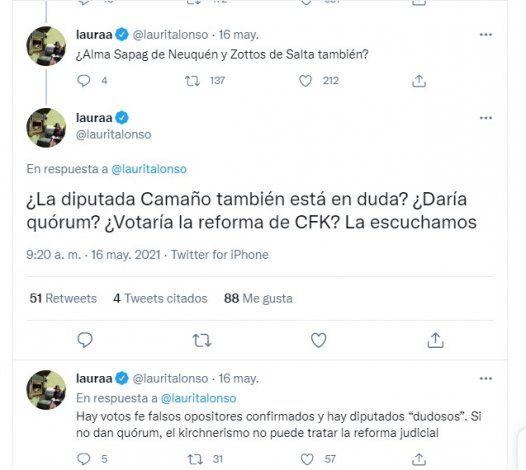 “¿Vota la reforma de la justicia para la impunidad de CFK y su banda?”, fue el mensaje de Alonso, en un hilo en el que , además de la neuquina, incluyó a Andrés Zottos (PJ/ Salta), Eduardo “Bali” Bucca (PJ/ Buenos Aires), Graciela Camaño (consenso Federal/ Buenos Aires) y los legisladores que responden a Roberto Lavagna, Alejandro “Topo” Rodríguez y Jorge Sarghini.