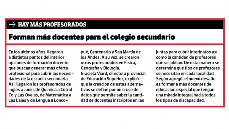 “Hoy en día no hay un poblador del interior que no tenga a mano una oferta educativa superior, ya sea técnica a de formación docente”, expresó Pablo Carranza, asesor de la Dirección Provincial de Educación Superior del Consejo Provincial de Educación (CPE). Si bien los centros orientados a formar maestros de escuela primaria ya existían en el interior, desde el 2015 esta oficina apostó a crear más carreras técnicas y a formar profesores secundarios.