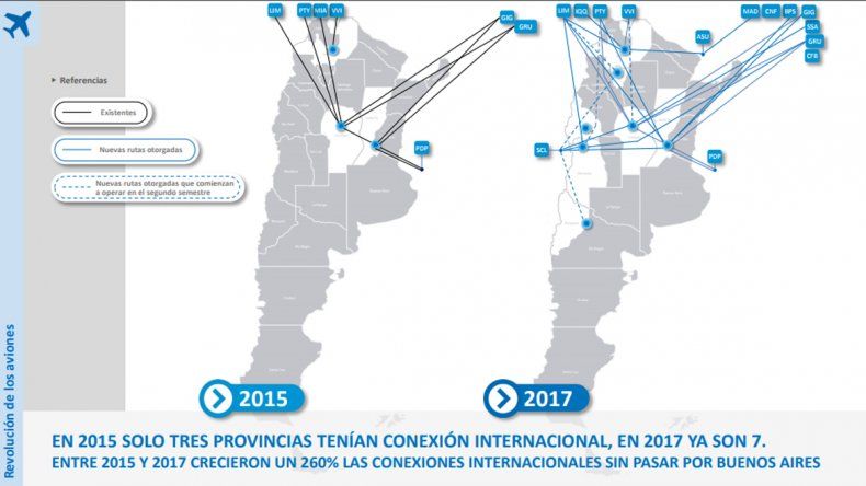 Las cifras récord del sector aéreo argentino se deben a una ampliación en la red de vuelos federal. Es que el Ministerio de Transporte de la Nación, en sus 18 meses de gestión, sumó nuevas provincias que conectan con el exterior y 20 nuevas conexiones entre ciudades del interior del país con destinos internacionales.