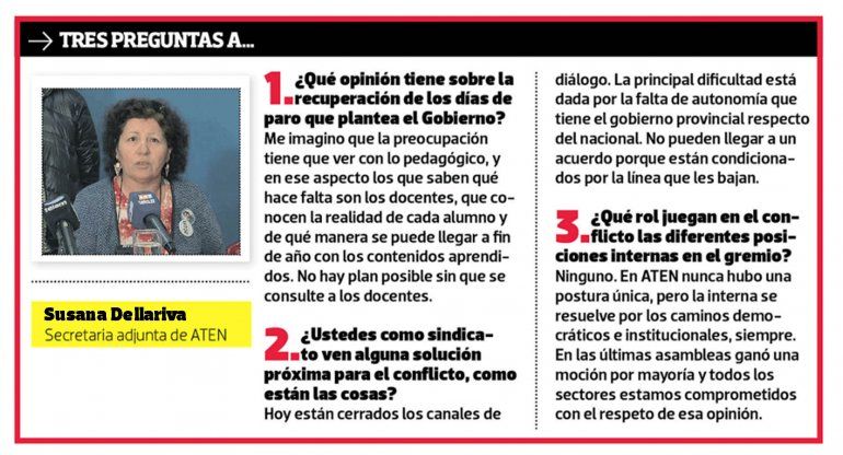“No quedó ningún canal de diálogo abierto desde la última reunión, en la que el Gobierno hizo una oferta que rechazó la mayoría de los docentes”, dijo ayer a este diario la secretaria adjunta de ATEN provincial, Susana Delarriva.