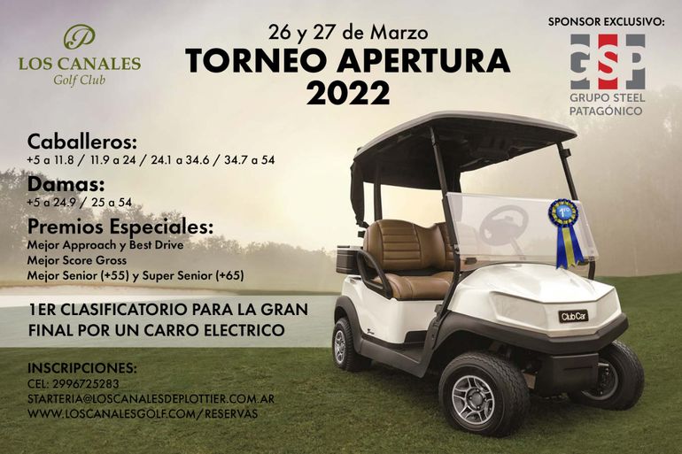 Todos aquellos jugadores (salvo los principiantes) que participen del Torneo Apertura de Los Canales de Plottier tendrán la posibilidad de llevarse un enorme premio: un carro eléctrico de golf.