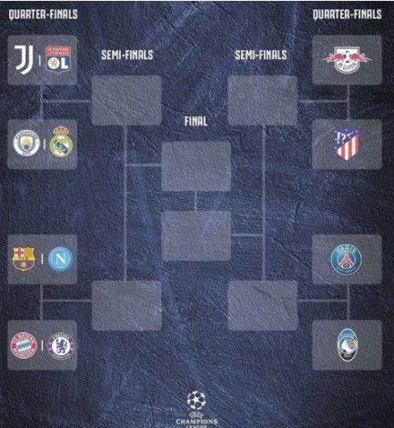 Los otros cuatro equipos que clasificarán a los cuartos de final surgirán de los cruces que tienen pendiente sus revanchas debido a que no pudieron jugarse en marzo pasado por el avance de la pandemia: Manchester City (2) - Real Madrid (1); Barcelona (1) - Napoli (1); Chelsea (0) -Bayern Múnich (3) y Lyon (1) - Juventus (0). Todos estos encuentros se jugarán el viernes 7 y el sábado 8 de agosto y los equipos respetarán sus localías originales.