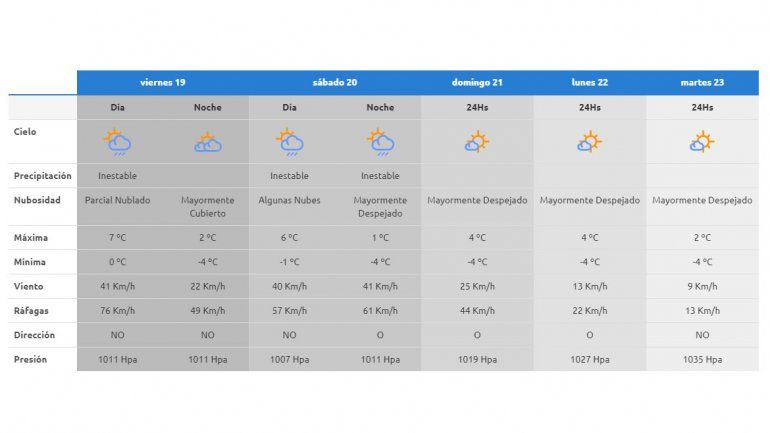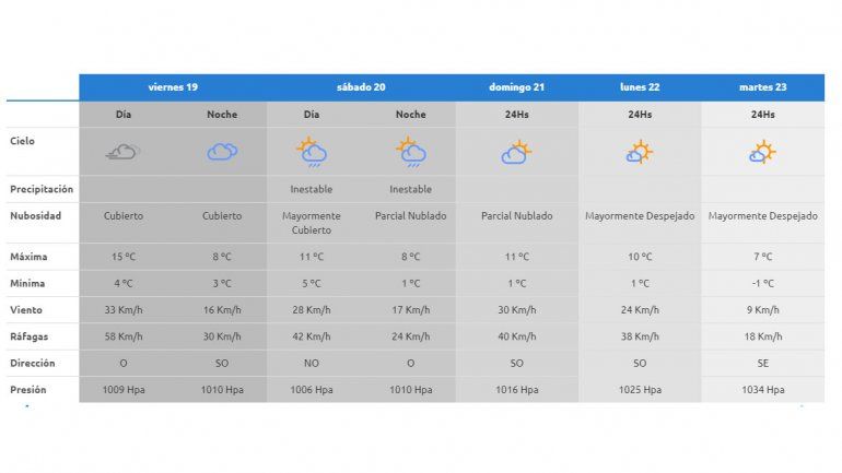 El viernes se mostrará inestable, con ráfagas de viento que alcanzarán los 76km/h. La temperatura oscilará entre los -4°C y los 7°C.