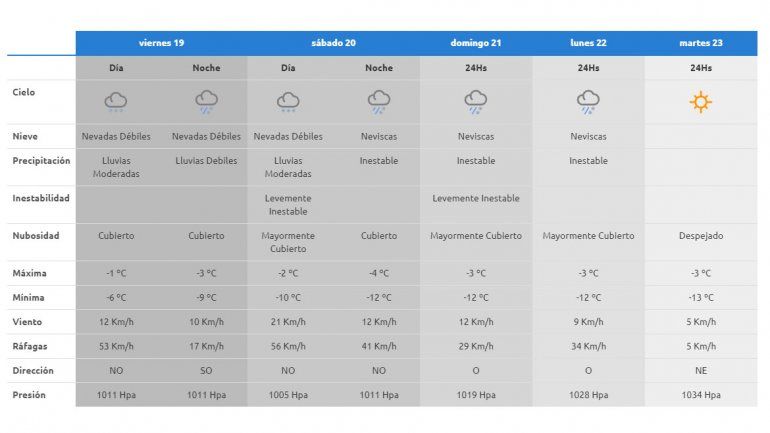 El viernes se mantendrá el pronóstico de nevadas y la temperatura oscilará entre los -1°C y los -9°C. Las ráfagas de viento serán de 53km/h.