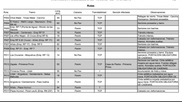 La Dirección Provincial de Vialidad informó el estado de las diferentes rutas de Neuquén, y alertaron que hay diferentes caminos que se encuentran intransitables.