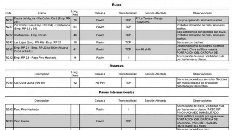 El resto de los caminos se encuentran Transitable con precaución, por diferentes motivos, como por ejemplo: sectores poceados, calzada con deformaciones, barro, animales sueltos y obras en ejecución, entre otros motivos.