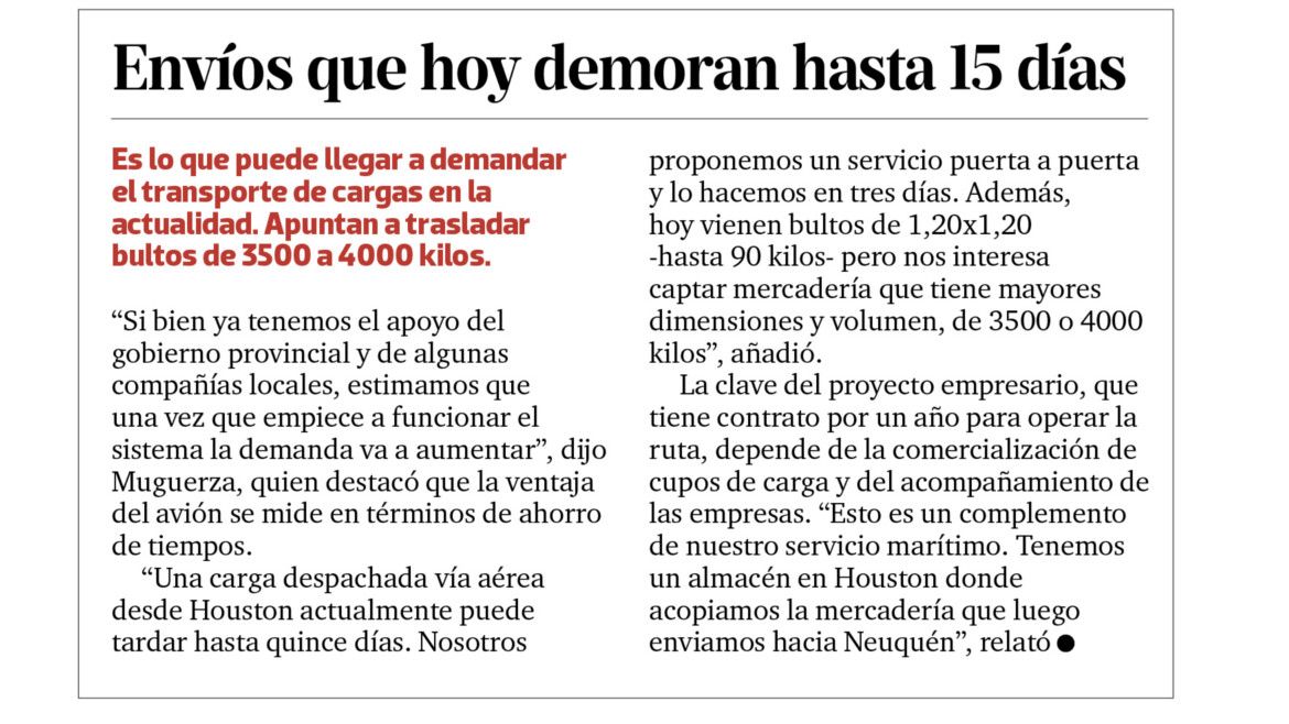 A horas de viajar a Houston para trabajar en la nueva ruta aérea de cargas, Natalia Muguerza, gerenta comercial del Depósito Fiscal, una de las tres empresas que llevan adelante el proyecto, confirmó que ya se vendieron las primeras 20 toneladas de carga que un Airbus 330 traerá a la provincia y explicó que la mecánica, “por el momento”, requiere de una escala en el aeropuerto Ministro Pistarini (Ezeiza).