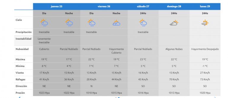 El jueves estará inestable, con probabilidad de lluvias, con registro entre los 19 grados y los 4, algo similar pasará el viernes con un leve aumento en la máxima, que podría alcanzar los 22°C.