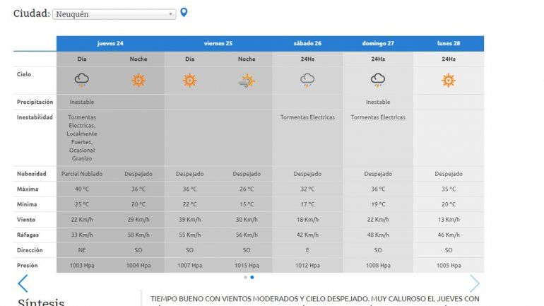 Con una mínima de 20 y una máxima de 40 grados, hay una alta probabilidad de formación de tormentas eléctricas de variada intensidad, acompañadas de chaparrones y ocasional granizo. Además habrá vientos moderados a regulares con ráfagas fuertes en áreas de tormenta.