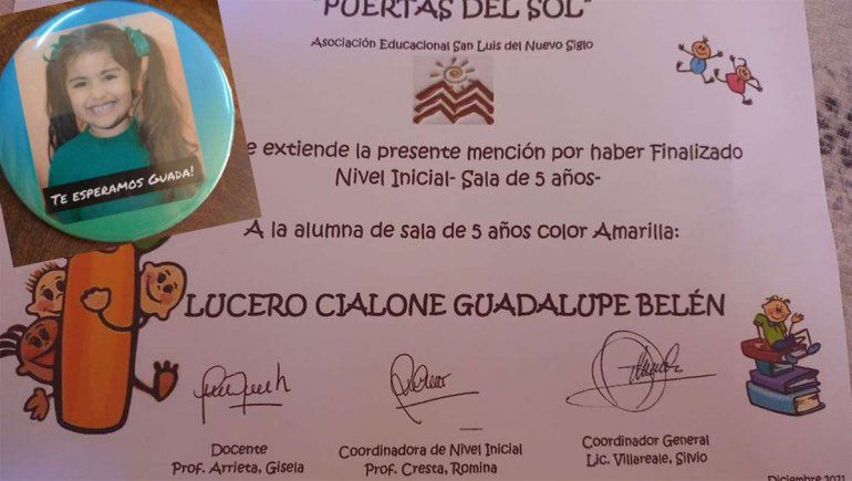 Este martes, en la Escuela Pública Autogestionada "Puertas del Sol", el hermano de Guadalupe, recibió el diploma de egreso del jardín de infantes que debía recibir la niña junto a sus compañeros y compañeras de escuela, quienes llevaban un pin con la cara de la pequeña, en un acto cargado de tristeza por la ausencia que aún no tiene resolución ni pistas firmes de investigación.