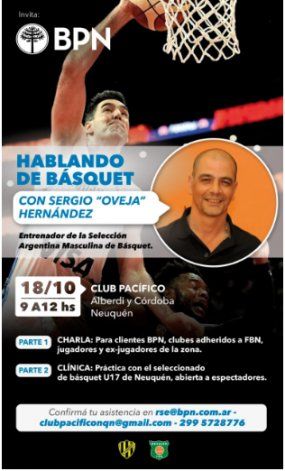 Desde las 9 compartirá un encuentro con diferentes clientes del BPN, afiliados a la FBN y jugadores locales. Luego se abrirán las puertas y el entrenador compartirá una clínica con la selección sub 17 de Neuquén. El evento es el Club Pacífico.