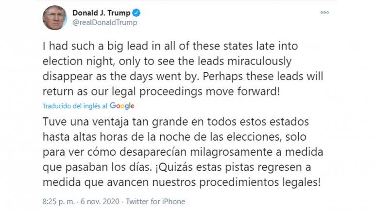 "Esto es pura desinformación. Se están contando los votos válidos. Esto es América, no Rusia", dijo en respuesta a los tweets de Trump que incluían sugerencias infundadas de fraude electoral.