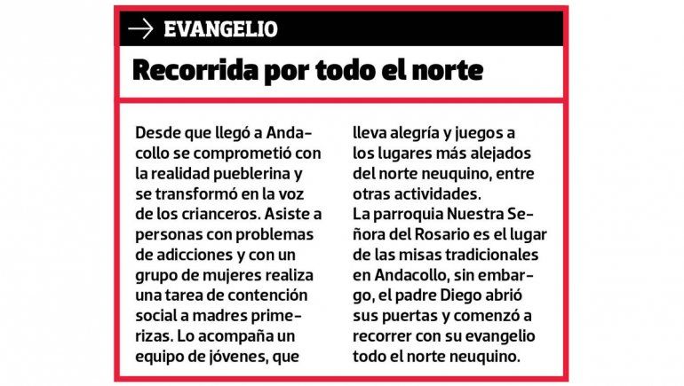 Desde hace 7 años, el padre Diego Canale llegó a Andacollo a escribir una historia idéntica a la que alguna vez plasmó Jesús. Pregonar la palabra de fe por cada rincón posible, desparramar amor en todos los corazones dispuestos a recibirlo, alzar la voz por los olvidados y marginados, llevar la cura espiritual y cubrir las necesidades sociales. A trabajar más y mejor por los carenciados. A ser simplemente un instrumento de Dios para mejorar la vida de cada habitante y población del mítico norte neuquino. “Soy un hombre que buscaba a Dios y descubrió que Dios lo encontró primero. Creo que en un montón de oportunidades salí a buscarlo y cada vez que salí él me ganó. Dios siempre me ganó”, afirma.