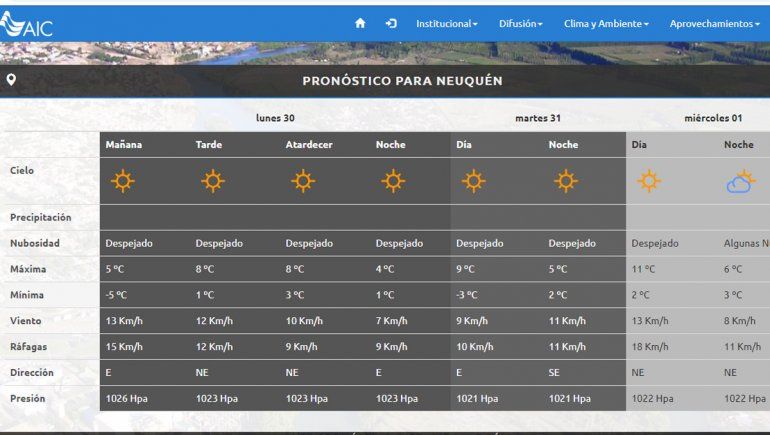 Para este lunes, la Autoridad Interjurisdiccional de las Cuencas (AIC), pronosticó cielo despejado con una temperatura mínima de -5 grados y una máxima de 5 grados durante la mañana.