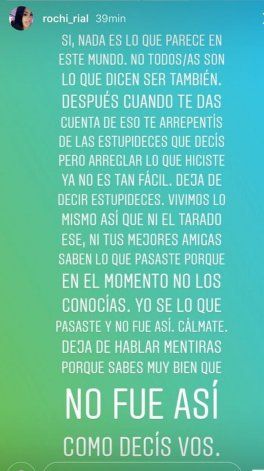 "Si, nada es lo que parece en este mundo. No todos son lo que dicen ser también. Después cuando te das de eso te arrepentís de las estupideces que decís, pero arreglar lo que hiciste ya no es tan fácil. Dejá de decir estupideces", lanzó Rocío y añadió: "Vivimos lo mismo, así que ni el tarado ese (N. de la R: el novio de Morena, Facundo Ambrosioni) ni tus mejores amigas saben lo que pasaste porque en ese momento no los conocías. Yo sé lo que pasaste y no fue así. Calmate. Dejá de hablar mentiras porque sabés muy bien que no fue así como decís vos".