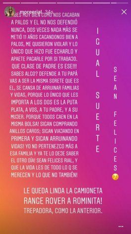 Lejos de irse al mazo, Morena continuó ventilando la interna familiar y contradijo a su hermana. "Sabés muy bien cómo nos cagaban a palos y él no nos defendió nunca. Dos veces nada más se metió. 11 años cagándonos bien a palos. Me quisieron violar y lo único que hizo fue echarlo y aparte pagarle por su trabajo. ¿Qué clase de padre es ese? ¿Sabés algo? Defendé a tu papá. Vas a ser la misma sorete que es él", sentenció y remató: "Se cansa de arruinar familias y vidas porque lo único que les importa es la puta plata. A vos, a tu padre y a su mujer ( N de la R: Romina Pereiro) ¡Porque todos caen en la misma bolsa! Sigan comprando anillos caros, sigan viajando en primera y sigan arruinando vidas. Yo no pertenezco más a esa familia y ya te lo dejé saber el otro día. Sean felices Rial y que la vida les de todo lo que se merecen y lo que no también. ¡Le queda linda la camioneta Range Rover a Rominita! Trepadora, como la anterior (N de la R: Agustina Kämpfer) Igual suerte, sean felices".