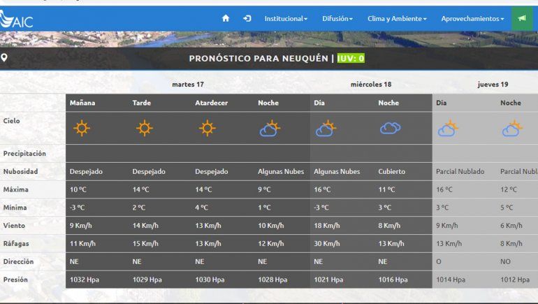 El miércoles seguirán el tiempo frío. La AIC pronosticó una mínima de 3 grados bajo cero, pero la máxima se elevará a 16 grados. Habrá algunas nubes durante el día mientras que por la noche estará el cielo cubierto. La temperatura descenderá a una máxima de 11 y una mínima de tres grados. Para el Servicio Meteorológico Nacional (SMN) habrá neblina durante la madrugada y la mañana. Además, se espera viento entre 23 y 31 kilómetros por hora por la tarde.