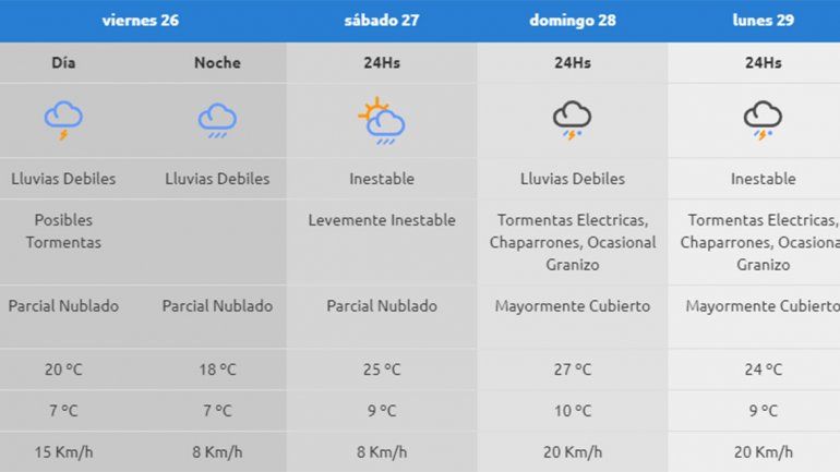 El fin de semana comenzará con lluvias débiles y la situación empeorará hacia el domingo, cuando se iniciaría un período de dos días de tormentas eléctricas y chaparrones y ocasional granizo.